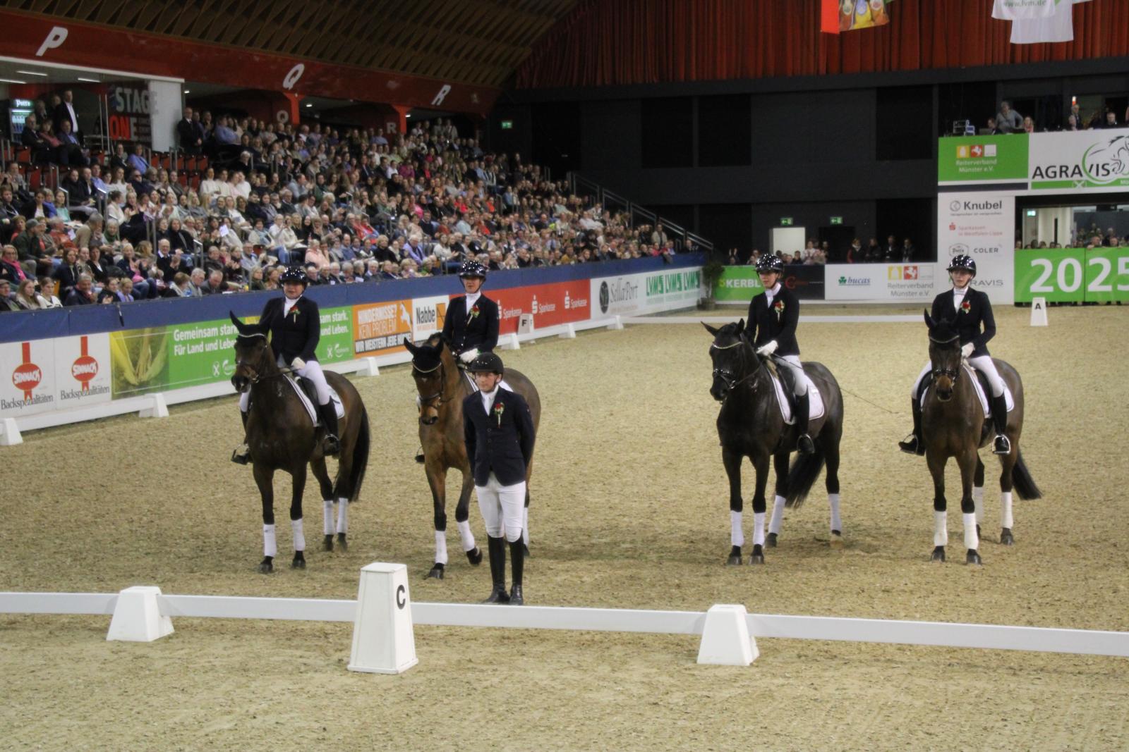 Beim Gesamtsieg wird auch der Reitverein Nienberge-Schonebeck ein Wörtchen mitzureden haben. Die Reiterinnen um Mannschaftsführerin Melanie Geßmann bewiesen einmal mehr, dass sie „wissen, wie Kürreiten geht“, brachte es Christoph Hess auf den Punkt. Mit fast ausnahmslos Neunen vor dem Komma bewerteten die Richter die Vorstellung von Maya Wilhelmer und Eddy, Lina Ribicic und Dacarda, Janin Löckemann und Bueno sowie Mia Klein und King Henry SV. Unterm Strich sammelten sie mit ihrer Kür 27,33 Punkte für das Team-Konto. 32 Punkte brachten sie bereits als bestes Team aus der Dressuraufgabe mit. Mit nun 59,33 Punkten geht es für der Reitverein Nienberge-Schonebeck von Rang zwei in den Parcours. Der Sieg im 87. Wettkampf um die Wanderstandarte der Stadt Münster entscheidet sich am Samstag um 11.30 Uhr in einem Springen der Klasse
